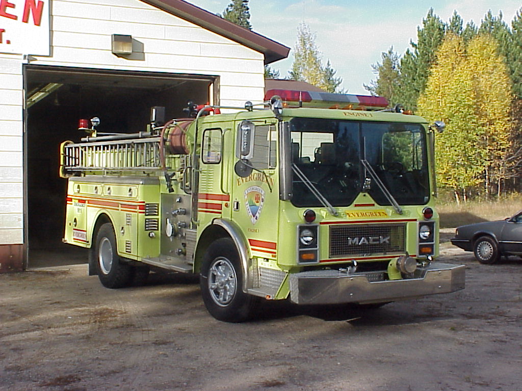 The Evergreen Fire Department recently purchased a 1981 Mack pumper. The apparatus is powered by a six-cylinder diesel engine and a four speed Allison automatic transmission. The pumper has a two stage 1250 GPM pump, 500 gallon poly tank and a foam system. The engine was purchased from the Lebanon Lakes Volunteer Fire Department of New Jersey. The cost was put at $8,000, plus shipping expenses.