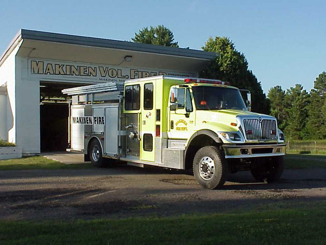 The Makinen Fire Department took delivery of a new four wheel drive pumper in May 2006. The apparatus has a 1250 GPM pump, 1,000 gallon tank, and a 2001 FoamPro foam system mounted on an International 7400 chassis. The pumper was built by Custom Fire Apparatus of Osceola, Wisconsin. The total cost was $307,000, with nearly $238,000 coming from a grant from the Department of Homeland Security.