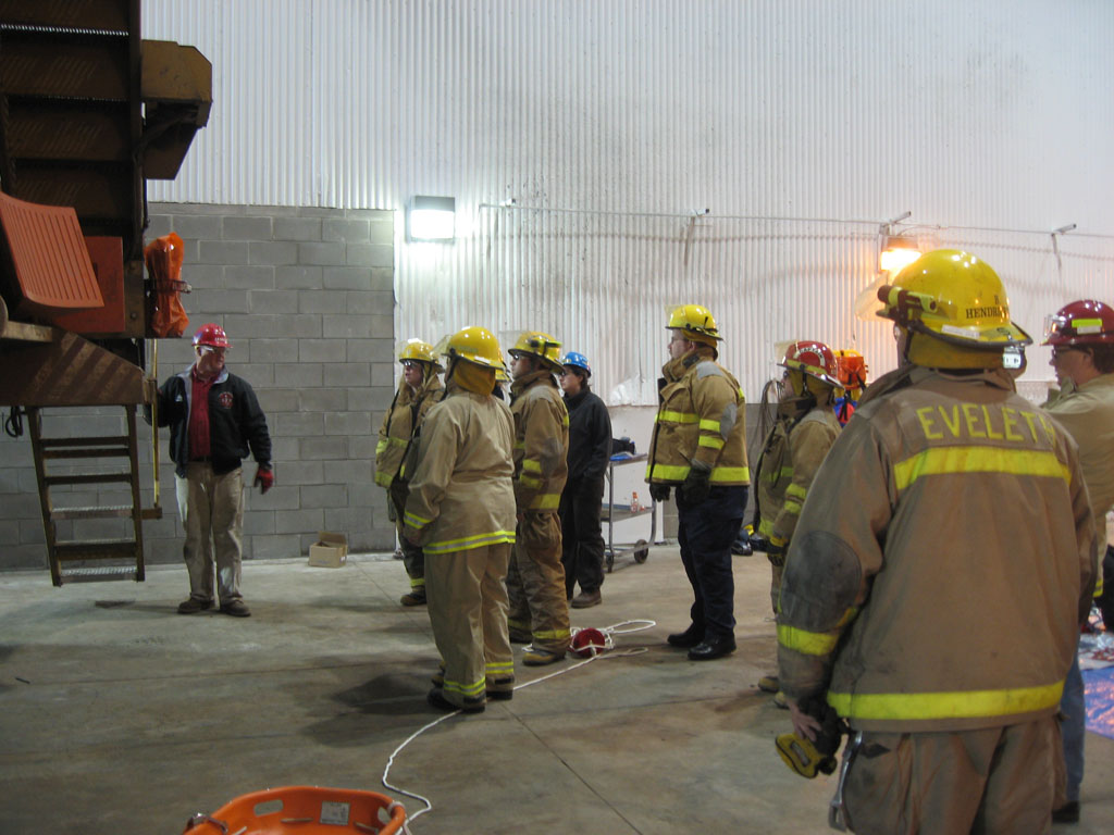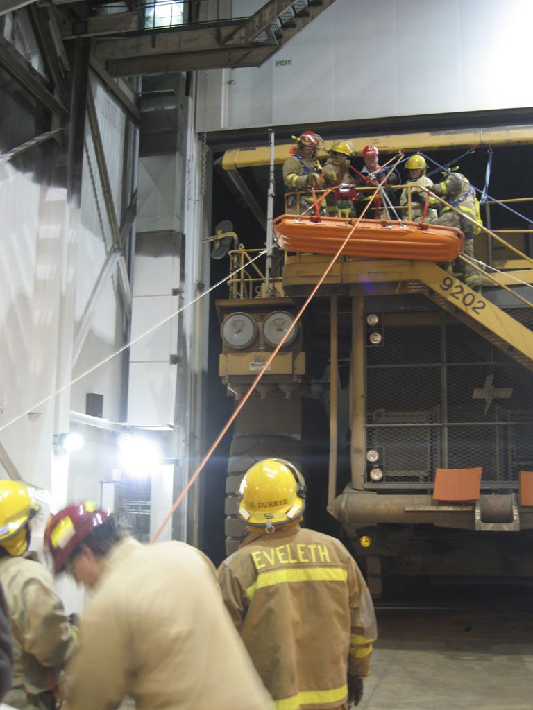 October 22, 2009 — Firefighters from the Eveleth and Fayal fire departments had an opportunity to participate in a mine vehicle rescue course at United Taconite in Eveleth. The training, conducted in cooperation with Mesabi Range College and instructor Erik Jankila, involved removing a patient from one of the mine's huge production trucks. The course also involved first responder personnel from United Taconite's Thunderbird Mine operation. "We are pleased to be working with United Taconite on this cooperative training effort," said Eveleth Fire Chief Steve Sklors. "United Taconite has a quality first responder organization and the fire departments rely on them just as much they rely on us. It is a great team effort!"