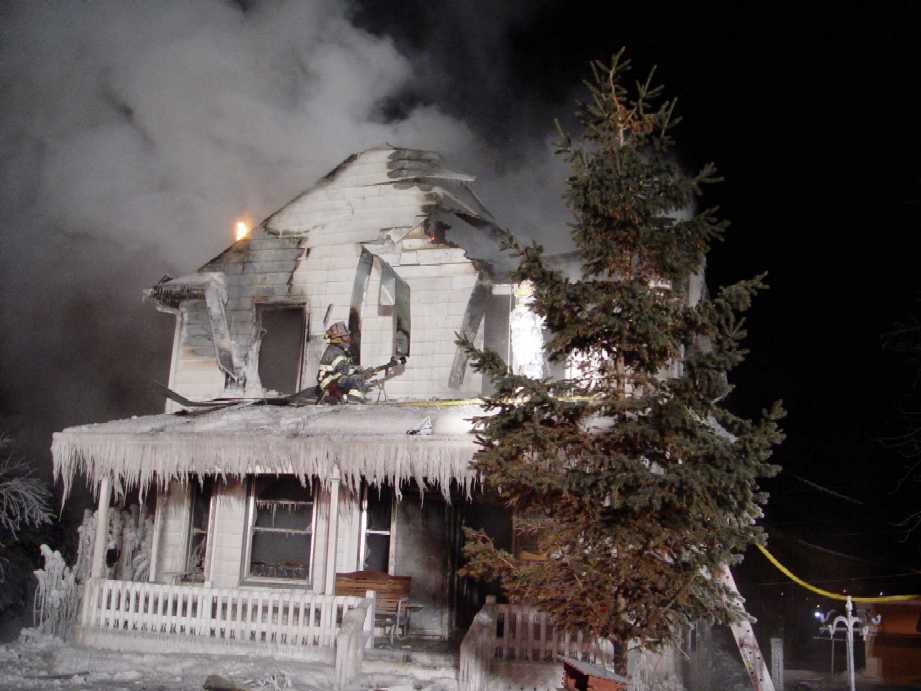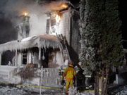 February 17, 2006 — Virginia and Eveleth firefighters were put to the test when a house fire broke out in Virginia's northside area. The blaze, which was reported around 3:30 p.m. in the 500 block of 13th Street North, was originally called in as a possible chimney fire. However, Virginia firefighters soon discovered that the fire was already racing its way through the large two story house. To make matters even worse, sub-zero temperatures and dangerous wind chills added to the firefighters' woes. The Eveleth Fire Department's Rapid Intervention Team (RIT) was dispatched for assistance. The interior attack was abandoned and an exterior attack involving two master streams and several hoselines came into play. As the huge fire was brought under control, firefighters were able to enter the house to perform salvage and overhaul operations. In all, firefighters remained on the scene for around eight hours. The home was extensively damaged with damages estimated around $100,000. One firefighter received minor injuries. While the cause remains under investigation, investigators determined that the fire started in the chimney area.