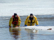 April 8, 2006 — When ice still covered Longyear Lake in Chisholm, members of the Chisholm Fire Department took part in a Cold Water/Ice Rescue Course, conducted by Jim Theodore of the Mesabi Range Community and Technical College.