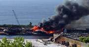 June 22, 2007 — Firefighters from Duluth and nearby Superior were called in to battle a major fire at True North Cedar, 1400 Railroad Street in Duluth. The fire was called in around 8:15 a.m. and DFD Assistant Fire Chief Mitch Peterson said he could see the fire and huge smoke column from over a mile away. Peterson told The Northland Fire Wire that he made the decision from the very beginning that the fire attack would be defensive. Firefighters were faced with protecting a large storage building full of wood products along with three 500lb-propane tanks. In addition to facing these obstacles, firefighters were hampered in establishing a water supply because lumber, private boats and other equipment blocked accesses to several drafting sites. At one time during the fire, four engines had to lay out 2,900 feet of house and relay pump from closest hydrant. A fire boat from the Superior Fire Department was also called in. The building, which housed the company's sawmill operation, along with several privately owned boats were lost Damages were estimated at over $500,000. Firefighters were able to protect the storage building and none of the propane tanks exploded. No injuries were reported. A preliminary investigation showed that the fire apparently originated from a waste conveyor machine.