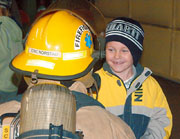 October 9, 2007 — First and second graders from the International Falls Elementary School pay a visit to the I-Falls fire station. Fire Chief Jerry Jensen and firefighters talked about fire safety and what to do should a fire break out in the home. The students were also instructed to remind their parents to check the smoke detectors in their house. In the picture below, I-Falls firefighter Eric Norstad makes friends with a first grader during the school visit. Photo: I-Falls Daily Journal - Lisa Kaczke