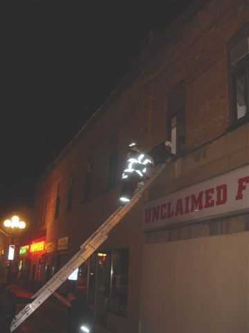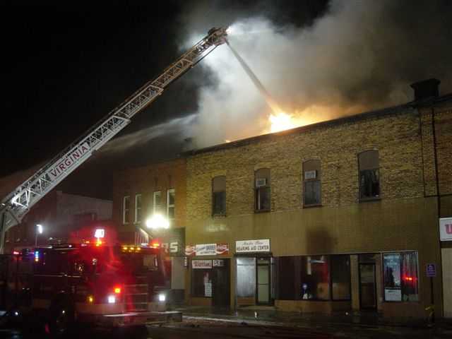 November 5, 2007 — Firefighters from six Iron Range communities (Virginia, Mountain Iron, Eveleth, Gilbert, Fayal Township and Hibbing) battled a huge fire in downtown Virginia. The fire was reported around 9:45 p.m. at 130 1/2 Chestnut Street. Virginia firefighters had to use a ground ladder to rescue several residents who were trapped in the second story apartments of the building (see picture below). Four businesses (Popper's Bar, Unclaimed Freight North, Warren's Barber Shop and the Hearing Aid Center) located on the ground floor of the building and an adjacent building were damaged while the second story apartments were either destroyed or had extensive smoke and water damage. According to the Mesabi Daily News, twenty-three people were left homeless by the blaze. Two Virginia firefighters and one occupant received minor injuries. According to Virginia Fire Marshal Roger Scott, firefighting efforts were hampered because the building had a common attic. Three aerial apparatus (Virginia, Hibbing, Gilbert) were used to battle the fire, along with numerous interior and exterior attack lines.