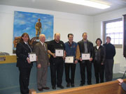 March 7, 2005 — Congressman Jim Oberstar honored four northeastern Minnesota firefighters with awards from the Congressional Fire Services Institute (CFSI). Former Ely Fire Chief Gary Klun was honored for his nearly 40 years of service to the Ely Fire Department. Congressman Oberstar noted that it was Klun and a fellow firefighter who built a water tender from the ground up. Klun was also cited for his endless work in the fire department and obtaining community funding for the "Jaws of Life" rescue equipment. Former St. Louis County Sheriff's Department Fire Investigator Steve Skogman of Mountain Iron received an award for his years of service to the sheriff's department and the Mountain Iron Fire Department. During the presentation, Congressman Oberstar said Skogman played a key role in a murder/arson case and was awarded the 2003 Fire Investigator of the Year by the Minnesota Chapter of the International Association of Arson Investigators. Former Mesabi Range Community and Technical College Fire Training Director Therese Elverum was honored for her work in developing Rapid Intervention Teams (RIT) in the region. Elverum was instrumental in bringing the program to a number of fire departments in northeastern Minnesota. Former Chisholm Firefighter Ted Garver, who passed away last year, was given high praise for his dedication to the Chisholm Fire Department and the Arrowhead Regional Firefighters' Association. Garver had been on the department for 24 years and was known for his "love" of the fire service. Accepting the award on his father's behalf was Jon Garver of Superior, Wisconsin. Pictured (l-r): Therese Elverum, Congressman Jim Oberstar, Steve Skogman, Gary Klun, Jon Garver, Julie Garver and Tracey (Garver) Eichten.