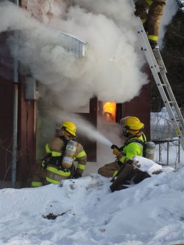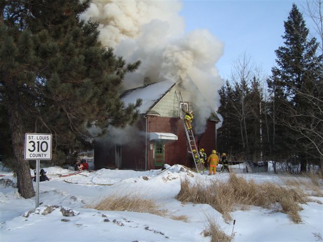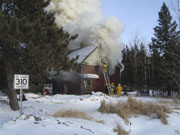 March 1, 2009 — A late afternoon fire has left a Clinton Township firefighter without a home. The fire was reported around 4:15 p.m. at the Dean Mattila Residence, located near the intersection of St. Louis County Highway 7 and Keenan Road. Two occupants and all of the family's pets were evacuated safely, although one firefighter reportedly received minor burns and was treated at the scene. No other injuries were reported. Clinton firefighters were assisted by personnel from the nearby McDavitt, Cherry and Fayal fire departments. Damages were estimated at about $75,000. The cause of the fire remains under investigation, but may have started in the chimney area near the roof. Firefighters remained on the scene for just over six hours.