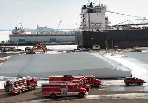 April 12, 2009 — Duluth and Superior firefighters spent the first week of March learning how to fight fires on Great Lakes freighters. The one training sessions, which involved classroom instruction and actual tours of several vessels, was conducted in cooperation with the U.S. Coast Guard in Duluth and the Maritime Administration, which is part of the U.S. Department of Transportation. In the photo, apparatus from the Duluth Fire Department is staged near the Walter J. McCarthy at the Port of Duluth.
