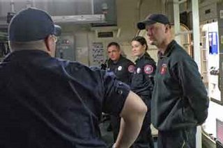 April 5, 2009 — The U.S. Coast Guard Cutter Mackinaw made a trip to Duluth to assist in icebreaking operations in and around the Twin Ports. The 240 foot Mackinaw is not only a buoy tender, but one of its key roles is to break ice for the Great Lakes shipping industry. During the Mackinaw's visit, members of the Duluth Fire Department had a chance to tour the ship and see its firefighting capabilities. The Mackinaw has an on-board fire department which is fully equipped and ready to handle any emergency. Firefighter training is critical to the Mackinaw because when you're "at sea," the ship's firefighters are the "only game in town." In the picture, Duluth firefighters get a firsthand look at the Mackinaw's Engineering Control Center (ECC).
